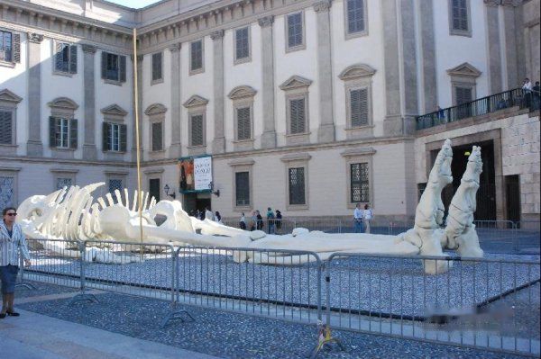 门前的广场上不知为什么竟然摆了这么一个巨形骨骼的模形,看上去怪异得厉害,引得不少人驻足观看,也许是为了配合什么展览的内容吧?
