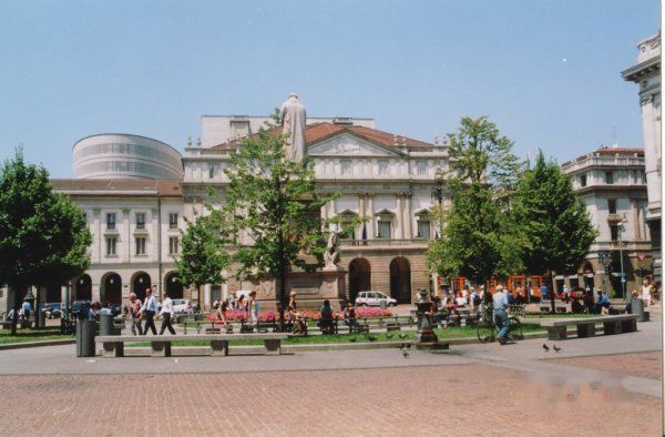 广场的西边是斯卡拉歌剧院及歌剧院博物馆,刚好是夕阳西下时分,实在是没有拍好逆光照片的技术了,只好把以前拍的一张广场照片拿出来,雕像后边的白色建筑就是斯卡拉歌剧院。