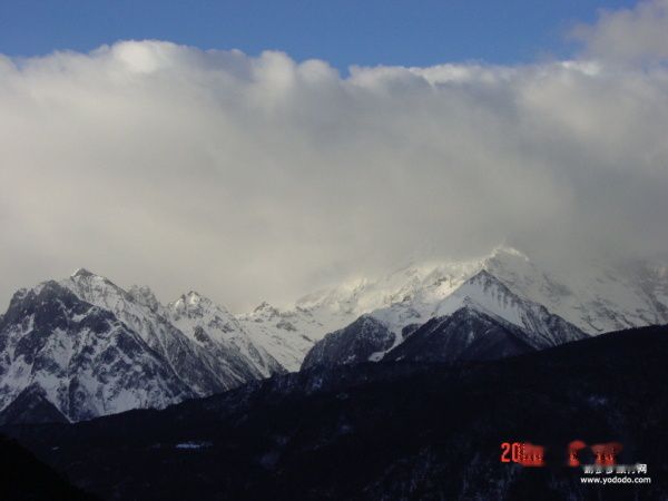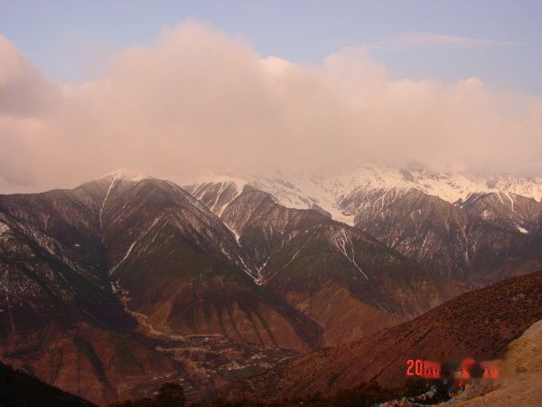 7点半左右,天空逐渐亮了起来,楼下观景台的人也越来越多,大家都是希望能看到“日照金山”,天边的云彩逐渐红了起来,说明太阳就要出来了,梅里雪山的众多山峰也纷纷从云层中显露了出来,可是,主峰“卡瓦格博”(王子的意思)依旧披着厚厚的面纱,好像在故意吊大家的胃口。天边出现了火烧云,雪山的轮廓也清晰了起来,可是依旧有一大团云围绕在主峰的周围,使人们很难看见梅里雪山的主峰山顶,这时候,人越来越多,大家纷纷拍照留念,我们当然也不例外。虽然不能拍到“日照金山”和“卡瓦格博”主峰,但是,能亲眼看到其它的众多山峰,如:神女峰、将军峰也是很幸运的。大约到了9点,主峰依旧被云层遮挡,看来这次我们没有机会看到梅里雪山的主峰了,不免有些遗憾。