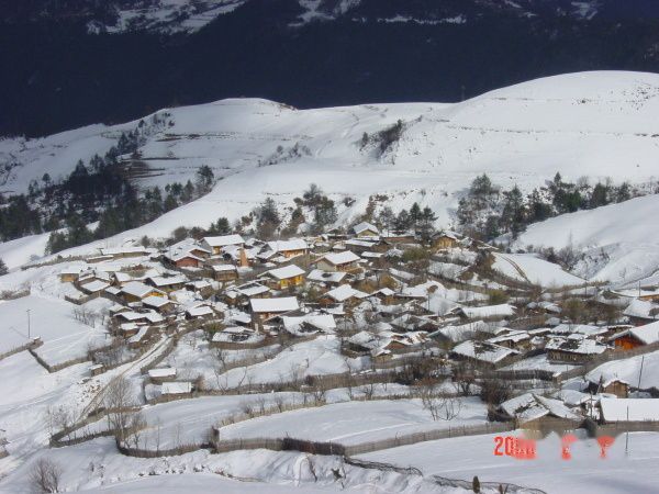拍照后,原路返回,回到中虎跳,坐车直奔香格里拉。一路上还是看不够的美景,而且,路上的雪也越来越多,可以预想到前阵子香格里拉的大雪。进入藏区后,可以在道路两旁看见白塔和玛尼堆,这些都是藏区的明显标志。我们的车大概在下午5点多来到了香格里拉县城,由于今天是初一,藏族人在初一不出门,所以道路上很少能看见人,一点过节的气氛也没有,只是偶尔听到几声鞭炮才告诉我们这是春节。