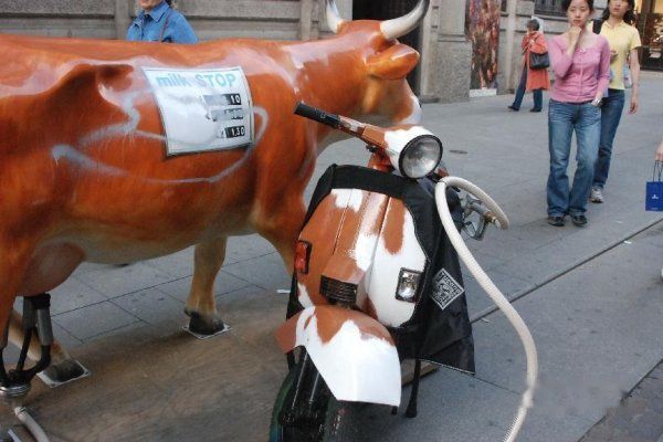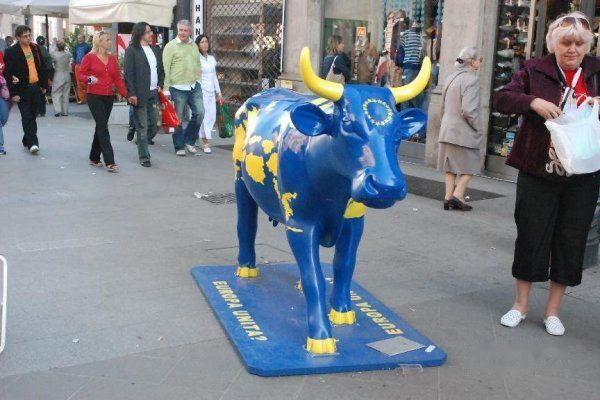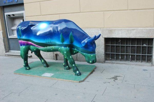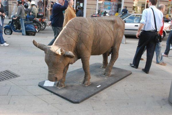 即然埃玛努埃尔二世长廊地面拼图中有小牛的图案,这里的这些小牛应该是顺着这个意思设计的。因为看不明白上边的文字,特意问了一句导游各式各样的小牛是干啥用的。导游说是当地人组织的一次环保主题的创意活动,就是找一些人设计牛的造形摆到街头,上书有关环保的内容。听明白了这个意思后再看这些小牛,感觉很像前些天某个文化组织找N多设计师作马造型创意的形式。不过这事儿要放在国内,大多会找上几个冠名企业,小收一笔费用的。