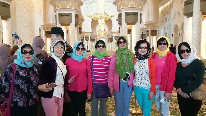 奇怪的是,同样都是参观清真寺,在迪拜参观清真寺,女性必须把头发包的严严实实,穿长裤长褂。而在这里参观清真寺,女性不需要包头,但却必须穿黑袍子。男的倒是不用穿黑袍子,搞得我们这一群老姐妹们,一个个变成了黑无常。