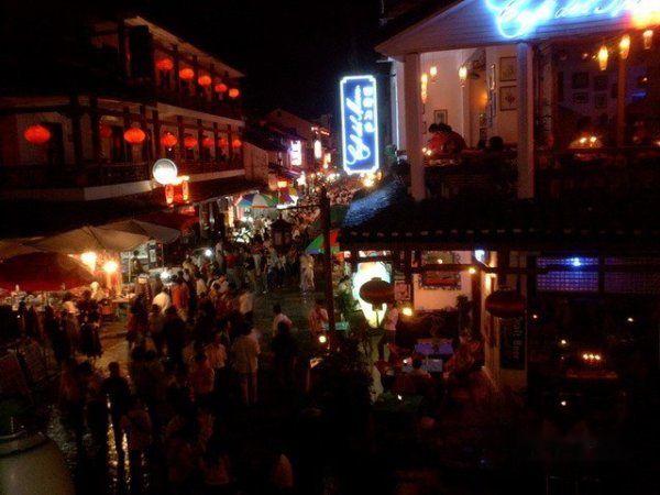 吃完米粉,又溜达回西街,天又开始下雨,雨势渐大,便想找个环境好点的咖啡吧坐下,经过JIMME BAR时看到餐牌黑板上写着FREE INTERNET,想想N久没上网了,便去那里喝喝咖啡上上网吧,没想到稍微上了下WOW就给人拉住去MC,算了,反正没事,去打发时间吧,结果一玩就是几个小时,弄的老板娘满脸不高兴,我只能又买了份水果沙拉,稍微多消费点。从JIMME BAR出来时已经6点多,但肚子还是很饱涨,就沿和西街到叠翠路到蟠桃路一直绕圈子,绕圈子时还揭穿了一个小骗局,他们这里有人摆摊卖一种会跳舞的小人,甚至可以按照他们的声音控制跳舞、坐、站等,但是无一例外的是,他们在表演时,右手都会假装若无其事的放在裤子里面,于是我让他们双手都伸出来表演,他们死都不肯。直绕到肚子觉得饿了,便跑到据说是观赏西街位置最佳的李萍咖啡屋用晚餐,点了25元的牛排土豆,价格是超便宜,味道也是超烂,好在景色位置不错,也就罢了。