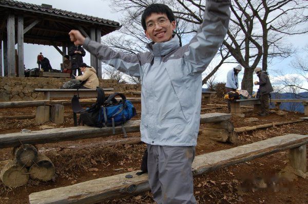 很顺利的到达了日の出山的山顶,今天的第一个目标点。很巧,山上居然飘起了雪花,很小很少,不仔细看几乎无法辨识,而且也只持续了一分钟左右的样子。不过能看到雪,还是很兴奋的。也许是因为兴奋过头的缘故,也许是泥泞的山顶实在太滑,在转身的时候摔了一跤,和泥浆来了个亲密接触,身上留下了不少的纪念品,也算是个小的插曲。