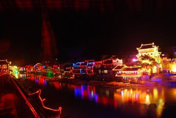 再回到旅店,外面还是下着磅礴大雨,大价钱租来的阳台无福消瘦,只得窝在床上写这流水帐游记。不过隔着窗户远眺,在霓虹灯装饰下的凤凰,还是相当美丽动人。