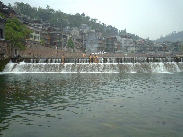 凤凰的客栈极多,大都位于沱江两边,我觉得有近百家也不足奇,不过我和父亲只看了3家,天气实在太过于闷热,加上30斤的背包,走不上几步便已汗流浃背。而所看之第三家,住宿条件极差,大约只有15平米左右,卫生间的马桶是蹲式,且除了有双拖鞋外,几乎无任何其他房间服务提供。价格也最贵,80元,其他两家都不过5,60元。不过这家名为水木酒吧的客栈,最大的优势便是阳台的观景,实在太棒,临江而伴,江对面遥望凤凰的古城门,江面还有凤凰沱江上唯一的一个碇步,游客众多(偷偷说句,我后来洗完澡光着屁股在阳台晃悠了下,不知可有旅客看到,在这么多人面前裸露身体,还真是第一次,嘿嘿),加上实在是又累又饿,便决定暂时先在这家住上一晚,如果感觉不好,明天再换一家。