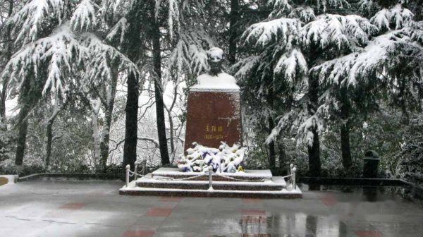 纪念馆在白雪的映衬下更加肃穆庄严,王稼祥塑像已经是积雪满面,好像又回到过雪山草地的现场。