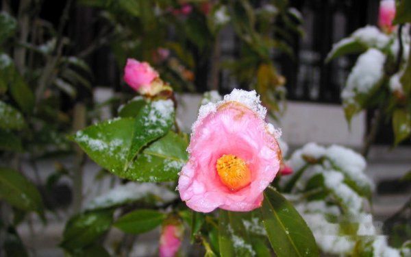 记得有一首歌说:当雪花爱上梅花,而眼前的茶花也被雪花爱上。
