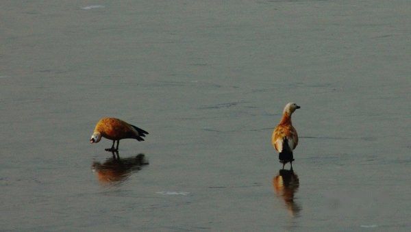 近处的湖岸飞来一对不知名的水鸟,火鸡的造型却配上一只鸭嘴,硕大的身躯覆盖着热烈的短裙,裸露的屁股上插着黑色的尾翼,简直是来了一对嬉皮士。