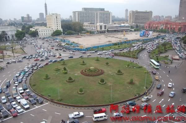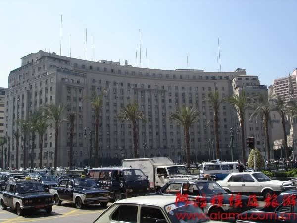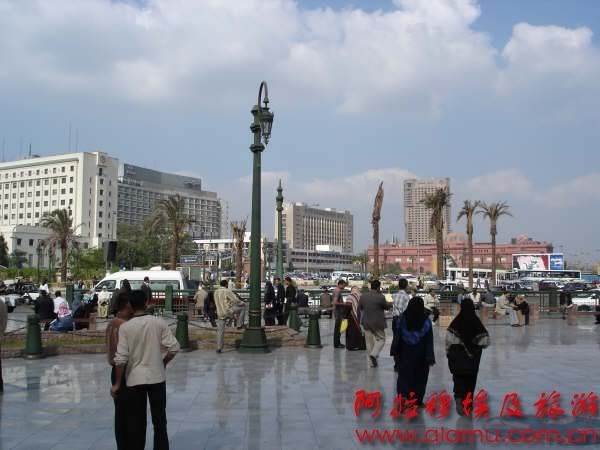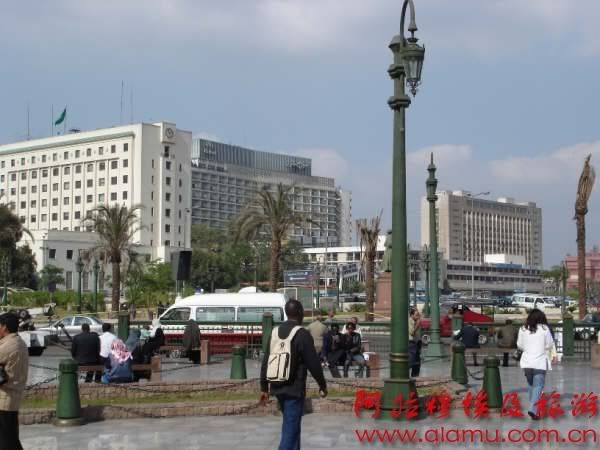 解放广场位于埃及首都开罗市中心,比邻尼罗河畔。广场面积辽阔,堪称埃及第一广场。由于广场占据市中心黄金地带,故广场的各种设施都是最现代化的。 从南面起,为埃及中央政府大厦,在这座大厦里面处理各种民意事务。中央大厦左后方向,即是埃及的一个“贵族大学”美国大学,其豪华气派自然不说。依次向左,有一些零零散散的店铺,扫过去之后,就是埃及国家博物馆了。人们都说,古埃及历史就浓缩在这个占地不大的博物馆里面。初建于1881年,当时建馆的目的是为了阻止发掘出来的埃及国宝流往国外。收藏各种文物有30多万件,陈列出的仅约6.3万件,系从公元前3200年至公元5~6世纪的出土之物。经过两次搬迁,1902年迁于现址。紧邻博物馆的是尼罗河酒店,很多航空公司都在这里设立办事处或售票处。左邻尼罗河酒店的是阿拉伯国家联盟,阿拉伯国家联盟相信我们从新闻上面已经看到很多,不用多做介绍了。阿盟(简称)前面是解放路,埃及著名的双狮桥就是将尼罗河两岸的解放路连接在一起。以尼罗河为界,东面是开罗省,西面成为吉萨省,但是由于埃及政府设立“大开罗行政”,因此,人们的意识上还是将吉萨的市区和开罗的市区并称为大开罗区。阿盟对面的一栋白色建筑,是埃及的前外交部,由于现在的事务繁多,这栋小楼已经不能满足办公的需要,现在的这栋白楼只能算是解放广场的一个点缀了。白色建筑旁边是解放广场上的清真寺,为了方便穆斯林的每日五次拜功。看完清真寺之后我们的眼光就又重新回到了中央政府大厦了。