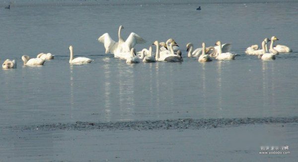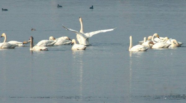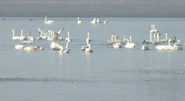 镜头里仔细看也不尽是白天鹅,天鹅之中也有黑头,当然天鹅群体不会将它当作异类,否则一定也会被立即驱逐。