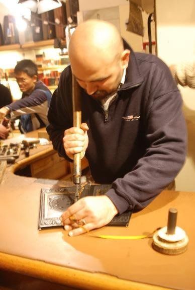 免税店里推销员顾自讲述着佛罗伦萨皮革的历史,倒是专心致志演示皮革烫金工艺的店员更让人可信。