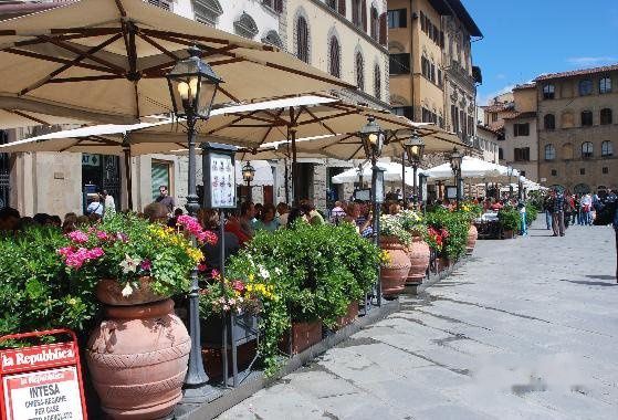 圣十字教堂广场前的咖啡馆里,人们品着咖啡消磨时光。