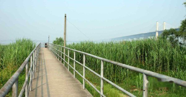 走到江滩绿地的尽头,又一条护堤隔开了绿地和原始的芦苇滩地,芦滩上几个老人已经采摘了大把的粽叶,此地看大桥异常雄伟,回想前年也是到达此地,正是芦滩、江水托起大桥的雄姿清除了疲劳和汗水,如今到此是一路坦途,不需要再经历千难万险。