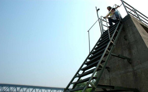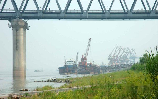 下栈道阶梯到达水边,第一眼看到的是桥孔后边的朱家桥码头,这是伴随在大桥旁的另一个芜湖骄傲,也是安徽通向世界的集装箱码头。可惜长江水道的潜力没有得到充分的利用,去年夏天到今年的长江枯水还在继续,但是码头建在大桥下游,也就是说芜湖大桥不会影响远洋轮船的进出,何况设计高度超过南京大桥。