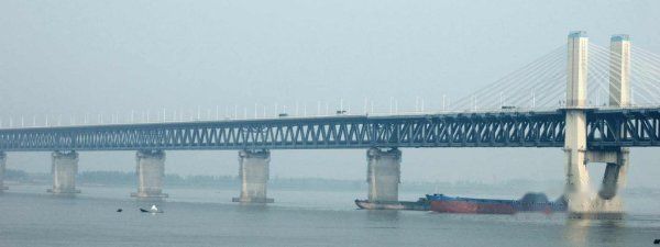 站在草萍小路上看大桥,比较前年在一片泥泞的江滩上更加惬意,大桥如此真切地闯入眼帘,桥下一片树林恰好映衬在四根立柱之间,江中是穿梭过往桥下的船只,桥上是飞跨南北的火车和汽车。