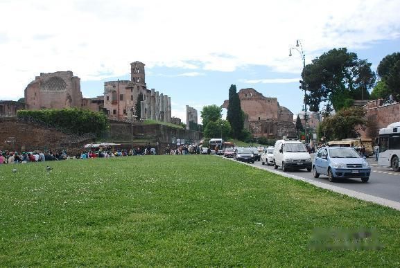 从斗兽场的停车场走下来,眼前很的路应该是叫Fori Imperiali吧。站在斗兽场前的路边沿街望去,就是古罗马的废墟,再过去一些,便是威尼斯广场。