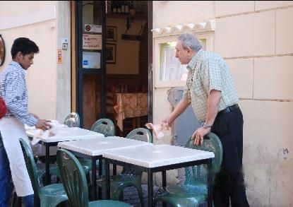 咖啡馆的老板与伙计,正在准备下午的露天坐位,当然下午是晒太阳的好时光,也会有着兴隆的生意。