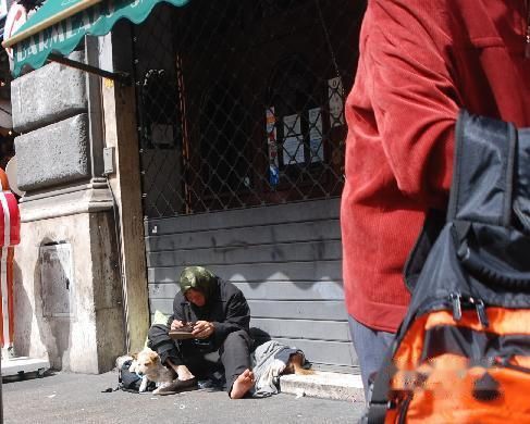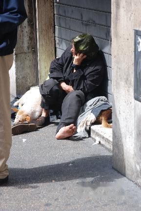 这位坐在路边橱窗边的吉普塞大娘,显然是行乞为生,居然也可以养活两条狗狗。心安理得地在大马路边赤足冥想,好不自在。