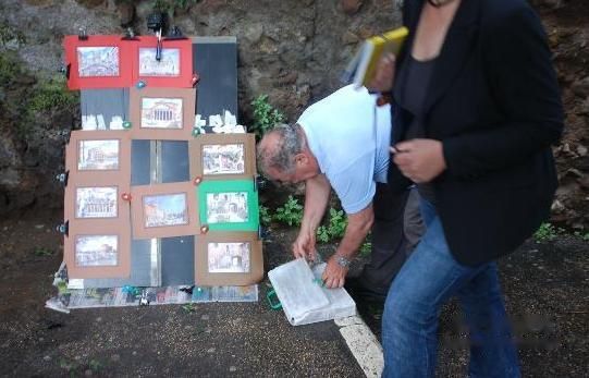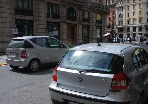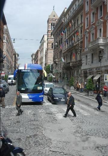 罗马的大街就是这个样子的,很难找到像国内的平坦马路。可能还会修修补补,在石砖地上再补点儿水泥什么的,无论多好的车也得在这种路面上颠来晃去的。斑马线上,人们各自走向自己的生活,意大利的汽车们虽然缺乏耐心,不时按两下喇叭,也只好这么等着。