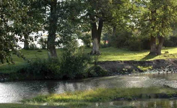 我们并不急于登车,因为入口处河湾景色也十分珍贵,走近桥下的河滩,河边的流水声虽然夹杂着风声但还是比较平静,滩上茂密的树林覆盖着草地,和谐而自然。