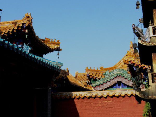 显通寺五座富丽堂皇的金殿金塔,在阳光照耀下金光夺目,据说仅贴金就耗费了巨量黄金,亦是全国少有。