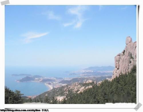看完石刻,站在山顶,看崂顶。看海。附看海面,能看见下面的村子和流清河的沙滩。蓝天上有几丝白云,环顾四周,心怀大开的感觉。山高人为峰,美景在险峰!