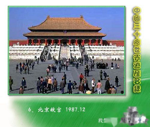 又称紫禁城,位于北京市区中心, 为明、清两代的皇宫, 有24位皇帝相继在此登基执政。始建于1406年, 至今已近600年。故宫是世界上现存规模最大、 最完整的古代木构建筑群, 占地72万平方米, 建筑面积约15万平方米, 拥有殿宇9000多间, 其中太和殿(又称金銮殿), 是皇帝举行即位、诞辰节日庆典和出兵征伐等大典的地方。故宫黄瓦红墙, 金扉朱楹, 白玉雕栏, 宫阙重叠, 巍峨壮观, 是中国古建筑的精华。宫内现收藏珍贵历代文物和艺术品约100万件。