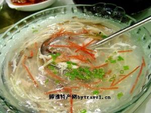“宋嫂鱼羹”是南宋的一只名菜,至今已有800多年历史。鱼羹色泽油亮,鲜嫩滑润,味似蟹肉,成为闻名遐迩的杭州传统名菜。 原料: 主料:桂鱼1条(约重600克)。 配料:熟火腿10克,熟笋25克,水发香菇25克,鸡蛋黄3个。 调料:葱段25克,姜块5克(拍松),姜丝1克,胡椒粉1克,绍酒30 克,酱油25克,精盐2.5克,醋25克,味精3克,清汤250克,湿淀粉30 克,熟猪油50克。 烹调过程: (1)将桂鱼剖洗干净,去头,沿脊背片成两爿,去掉脊骨及腹腔,将鱼肉皮朝下放在盆中,加入葱段(10克)、姜块、绍酒(15克)、精盐(1克)稍渍后,上蒸笼用旺火蒸6分钟取出,拣去葱段、姜块,卤汁滗在碗中。把鱼肉拨碎,除去皮、骨,倒回原卤汁碗中。 (2)将熟火腿、熟笋、香菇均切成1.5厘米长的细丝,鸡蛋黄打散,待用。 (3)将炒锅置旺火上,下入熟猪油(15克),投入葱段(15克)煸出香味,舀入清汤煮沸,拣去葱段,加入绍酒(15克)、笋丝、香菇丝。再煮沸后,将鱼肉连同原汁落锅,加入酱油、精盐(1.5克)、味精,烧沸后用湿淀粉勾薄芡,然后,将鸡蛋黄液倒入锅内搅匀,待羹汁再沸时,加入醋,并洒上八成热的熟猪油(35克),起锅装盆,撒上熟火腿丝、姜丝和胡椒粉即成。 BNBVISTA.COM
