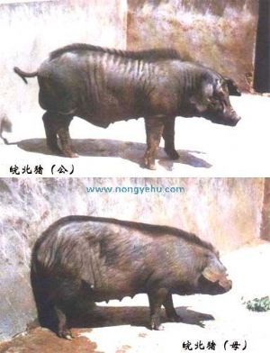 外貌特征:皖北猪体型中等大小,被毛全黑色。头轻秀适中,耳较大且下垂,嘴筒长而直、额部有菱形皱纹。体躯较长,背腰平直,腹部较大而不下垂,腿臀部较丰满,体质结实。07对以上,排列整齐。