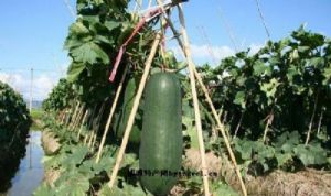 冬瓜(学名:Benincasa hispida (Thunb.) Cogn.)葫芦科冬瓜属一年生蔓生或架生草本植物,茎被黄褐色硬毛及长柔毛,有棱沟,叶柄粗壮,被粗硬毛和长柔毛,雌雄同株,花单生,果实长圆柱状或近球状,大型,有硬毛和白霜,种子卵形。