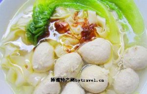 云霄特产水面,其实跟我们通常说的“清汤面”差不多,只不过云霄人把清汤面玩出了一点新花样。“一要把面粉搅出筋来才做面条;二要汤鲜,肉丸汤加猪骨汤,那汤便有味了;三要浇头好,清汤水面还要浇上几粒馄饨和肉丸。别处的馄饨馅用肉茸或千刀肉,我们云霄的馄饨用碎肉,入口能咬出小肉块,方能吃出肉香。而肉丸,是把新鲜瘦猪肉打成肉茸,再加玉米淀粉做成,吃到嘴里脆响。最后,浇上一点用猪油炸成金黄色的葱头,便满碗荤香了。如今也有人把面条用葱油、生抽干拌,再配一碗馄饨、肉丸汤,吃法变了,但水面不变,还是干湿共生。”卖水面的小吃店老板介绍说。