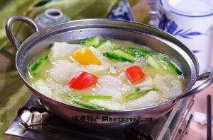 【制法】先将丝瓜削去皮一剖二爿,去掉芯,切成6.5厘米左右长的一指条,用刀修成一样粗细。鲜蘑菇剪去根,用冷水洗净,捞出沥干水。炒锅上火,放油烧到三成热,放入丝瓜,用铁勺推拌拉油,拉至变色收缩,倒入漏勺沥油。原锅上火加鲜汤,放入丝瓜、鲜蘑菇、黄酒、精盐、味精,用旺火烧滚,改温火焖一焖,焖到鲜蘑菇熟软转旺火,淋湿淀粉着薄芡。煲上火加底油烧热,放入生菜垫底,随即倒入鲜蘑菇、丝瓜,淋入鸡油,撒上火腿末,上盖加热2分钟即成。本品特点为色泽洁白,红绿相映,吃口鲜嫩,祛暑清心,凉血解毒,通络行血,利肠下乳,补脾开胃。