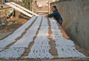 在村里,我们找到了制作排粉多年的胡梓勤师傅,他向我们介绍:制作排粉是个复杂的过程,先选用本地产的优质大米,放在陶缸内浸上一天两夜,用村上的泉水洗上3道。然后磨成粉,用棉布包好榨干,做成圆形的大果仂,放进水里煮,待煮到半生半熟时,捞出做成七斤一个的柱形大果将其放进榨粉机压榨,就可见一丝丝雪白的排粉从机口处流出,滑入大锅,待煮上几分钟,便可捞出放入门口的大缸内,由当地妇女们用温水洗上三遍捞出放在竹排上;最后把竹排抬到村头晾晒几个小时后,便可成品。做排粉是件非常辛苦的事,每天凌晨4-5点,他们就要起床开始干活,一直做到中午11点才完成,一天要做100多斤米。不知不觉,我们已看完整个制作过程,起身离开村子,来到村口,看见一群小孩正在排粉前嬉戏----半下湖排粉的将来就要靠他们了. 天下民宿