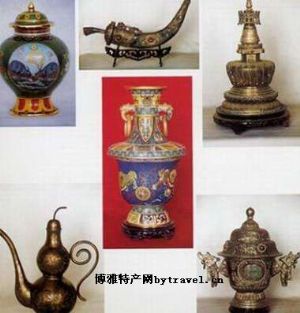 成品经设计、造型、铸模、库活、錾活、馏金、作旧等多道工序制成。其中库活工序为按铸模的造型将铜、铁、锡等金属板材打制焊接于所制器物的坯胎;錾活为用金属刀具在坯胎上雕刻花纹图案,其雕工技法分阳錾、平錾或平阳结合,立体效果明显;镶宝为根据设计要求于器物上镶嵌、红、绿宝石、鸡心石、松石等名贵宝石与金银花丝,以显示产品的高贵;馏金为将黄金溶解-中,刷涂器物表面,用炭火烘烤,玛瑙轧光;作旧则采取特殊工艺处理,令新制器物变旧,模仿出土文物,达到仿古制品的艺术效果。造型古朴优雅,粗犷大方。装饰题材丰富。