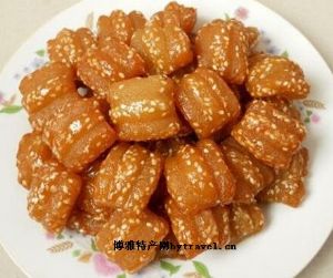 始创于明朝末年的单县蜜三刀,以色、香、味、型俱佳而久负盛名,深受苏、鲁、豫、皖四省群众的喜爱。单县密三刀采用精细面粉、植物油、白糖、蜂蜜、桂花芝麻仁等为原料,经和面、成型、油炸、过浆等一系列工序精制而成。该产品呈长方型,中间有两条刀痕,挂浆和粘附芝麻均匀,表面光亮晶莹,呈棕黄色。食之香甜可口,绵酥细腻。