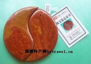 据历史记载《尚书.夏书》中的《属贡》此石产于泗水之滨。现具考古及科学研究证明,此种石就是传说中的古代名石“泗滨砭石”,也称为红磬石,因其石色,红黄相间,代表皇权尊贵,吉祥如意。此种石敲之有“金声玉振”之感。亦有通天地,泣鬼神之美妙,磬是古代的一种敲击乐器,音域从低至高,磬体由大致小,声音优美清纯,声波穿透浩空,余音袅袅美妙绝伦,在古代曾做供奉之佳品为皇帝专用磬。后因此种石极为稀少,改为他地进贡的黑色的,....就不用敲之了,只是作为一种祭祀的信物而已。