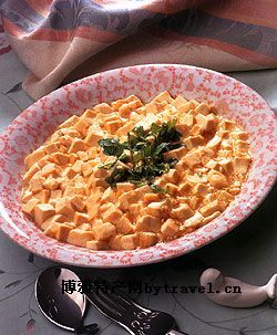 3、油烧至6成热,放葱姜末呛锅,再放入豆腐泥,海米,雪里蕻,精盐,料酒,炒3分钟装盘,撒上葱段即成。