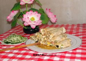 薄饼,然后把薄饼烙至黄色麻子花状,中间凸起,迅速取出,置干盖有面垫的容器中备用。其中馅一般按每斤饼豆腐8两,熟猪肉(成熟牛、羊、鸡肉)3两,鸡蛋3个,