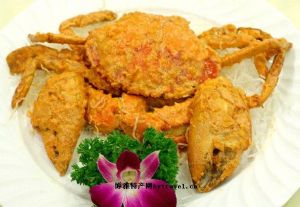 将海蟹去掉脐、蟹盖和鳃,冲洗干净,剁成两块,加料酒,味精、盐、辣椒粉腌片刻。将海蟹刀口断面处蘸淀粉后,入油中炸呈金黄色时捞起即成。此菜的特点是:螃蟹呈红赤色,味咸香辣,肉质嫩鲜,是威海的特色菜肴之一。通常情况下螃蟹20-35元一斤,按时价不等。
