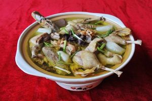 主料是养鸭户用稻谷、杂粮作饲料,散放饲养的生长期一年以上的淮南麻鸭。以鸭肉、鸭杂、鸭血和当地山萝卜为原料,添加当地山泉水,采用当地传统厨艺烹制而成的鸭汤,营养丰富,肉质酥嫩,鸭血爽滑、汤清味鲜,萝卜清香,甘甜爽口,风味独特,令人常食不腻。以能清火解毒、滋补去湿、养胃补肾、除痰健肺,录入古籍药典《名医别录》,被称为“妙药”和滋补上品。