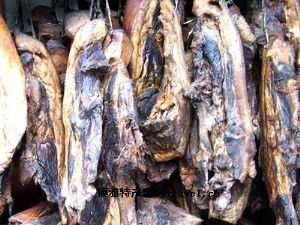(4)用松柏枝加核桃壳、花生壳、桔子皮等柴草料进行烟熏烘烤,月余后待肉变棕红时即可。 天下民宿
