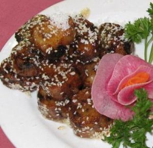 制作方法:将山药1500克去皮剁碎,大枣500克去核,果料切碎,两料拌匀后稍加水和面粉,搅拌均匀,用油皮将拌匀的料裹包好,上笼蒸5分钟;准备消毒过的干净豆包布一块,将蒸得的原料趁热置于布上,捏成三角状长条,凉后切成小手指厚般的块,入七成热的油锅,炸成焦黄色时捞出;另用锅加油、水、桂花、白糖,小火熬成糖稀,将炸得的卷果倒人,裹上糖汁,撒上白芝麻和白糖,软绵香甜,十分可口。因其有滋补作用,去南来顺饭庄用餐的食客每每点要,成为饭店的名牌小吃之一。
