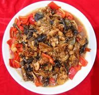 通山县九宫山是湖北旅览避暑胜地之一。在长满绿苔的岩石间,生长着一种石鸡(青蛙),每只重250克左右,肉质细嫩肥美。黄焖九宫石鸡选用肥嫩腿肉,配以葱、姜、高汤等调料,用小火焖至酥烂。加味精、胡椒粉、糖、淀粉勾芡,起锅装盘即成。系佐酒佳肴。