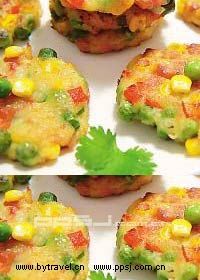 2、红椒去蒂和籽,切成细丁;火腿也切成细丁;洗净青豆和玉米粒,沥干水份烧开锅内的水,加入1汤匙盐,倒入青豆、玉米粒汆烫30秒,捞起沥干水