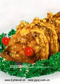 糖醋脆皮鳜鱼,制作方法是:将活鳜鱼去鳞、鳃,从腹部切口去内脏,在鱼身两侧每隔一寸剞一大反刀,用精盐、绍酒抹遍鱼身内外,腌十分钟,然后均匀地抹一层湿淀粉。将玉兰片、水香菇,均切成细丝。