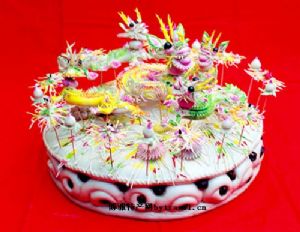 盘顶,是不能吃的,它是祭祀活动中的专用品,是摆在食箩顶节的面塑艺术品,有人物,有动物,动物体现了浓浓的地方特色,面塑人物则是比较普及的手工艺术。