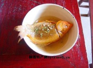 选鲤鱼一条,从鱼肚剖开,去龙骨(主刺),加入料酒、姜葱、盐、味精等调味品,腌制十分钟。将油烧至八成热,鲤鱼入锅,炸成金黄色,揭起备用。用少量的油将花椒、干辣椒、八角、桂皮炸香,加入渣江茹粉,煸炒。再将整条鱼放入,加适量水,以盖过鱼面为佳,焖十分钟即可出锅。
