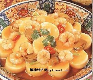 3、每块豆腐中间挖去一部分嫩豆腐(底不能挖穿),然后填满肉馅,再在肉馅上面横嵌一只大虾仁。 天下民宿