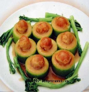 2、将节瓜去蒂,用竹片轻刮去外皮,保留少许皮青,横切成约5厘米厚的件,挖去瓜瓤,用沸水滚至五成熟,以洁净布吸干水分,在空洞内壁涂上干生汾,将馅料酿入。